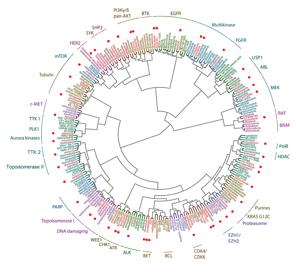 [右] Oncolines™ パネルでプロファイリングされたすべての化合物の階層的クラスタリングを示すクラスタリングホイール。